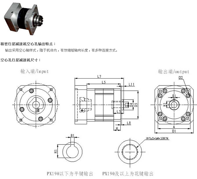 說明:空心孔輸出時,與減速機D3配合的軸徑將與原標準減速機軸徑要小,幫扭矩可根據與D3配合軸徑來計算,其余參數均可參照PX標準系列。